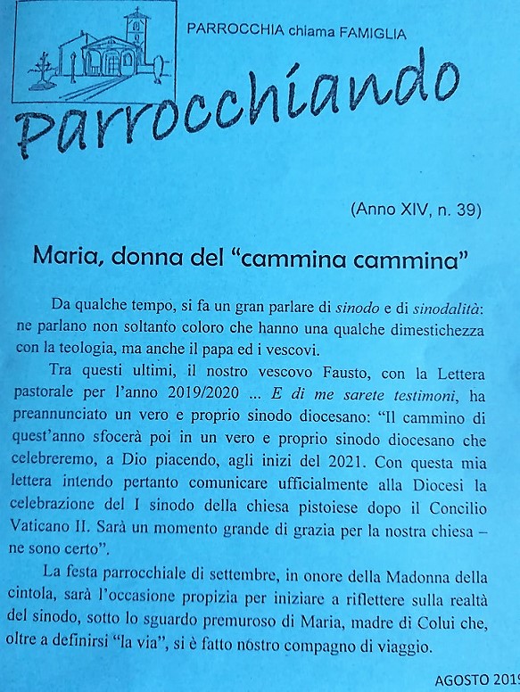 FESTA PARROCCHIALE DELLA MADONNA DELLA CINTOLA SETTEMBRE 2019 Domenica 1 settembre, XXII durante l’Anno liturgico ore 11.00: Messa (utilizzeremo il formulario Maria Vergine immagine e Madre della Chiesa), raccolta di generi alimentari per la Caritas diocesana e distribuzione di dolci (offerta libera) ore 18.00:…