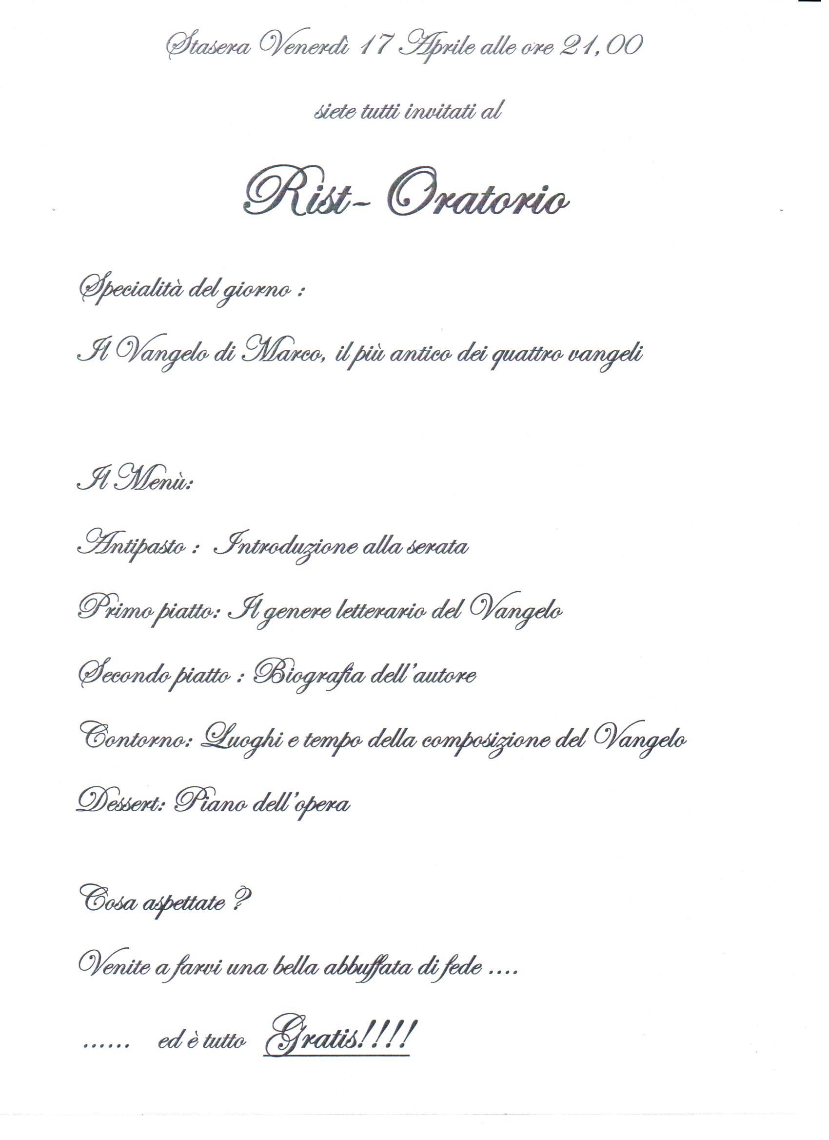 L’idea ce l’ha fornita un nostro compaesano, e lo ringraziamo tantissimo, che sul web ha definito “ Rist-Oratorio” i locali dove ci riuniamo per le attività parrocchiali, come, per esempio, questa sera in occasione di un incontro di approfondimento sul Vangelo di Marco (nella foto…